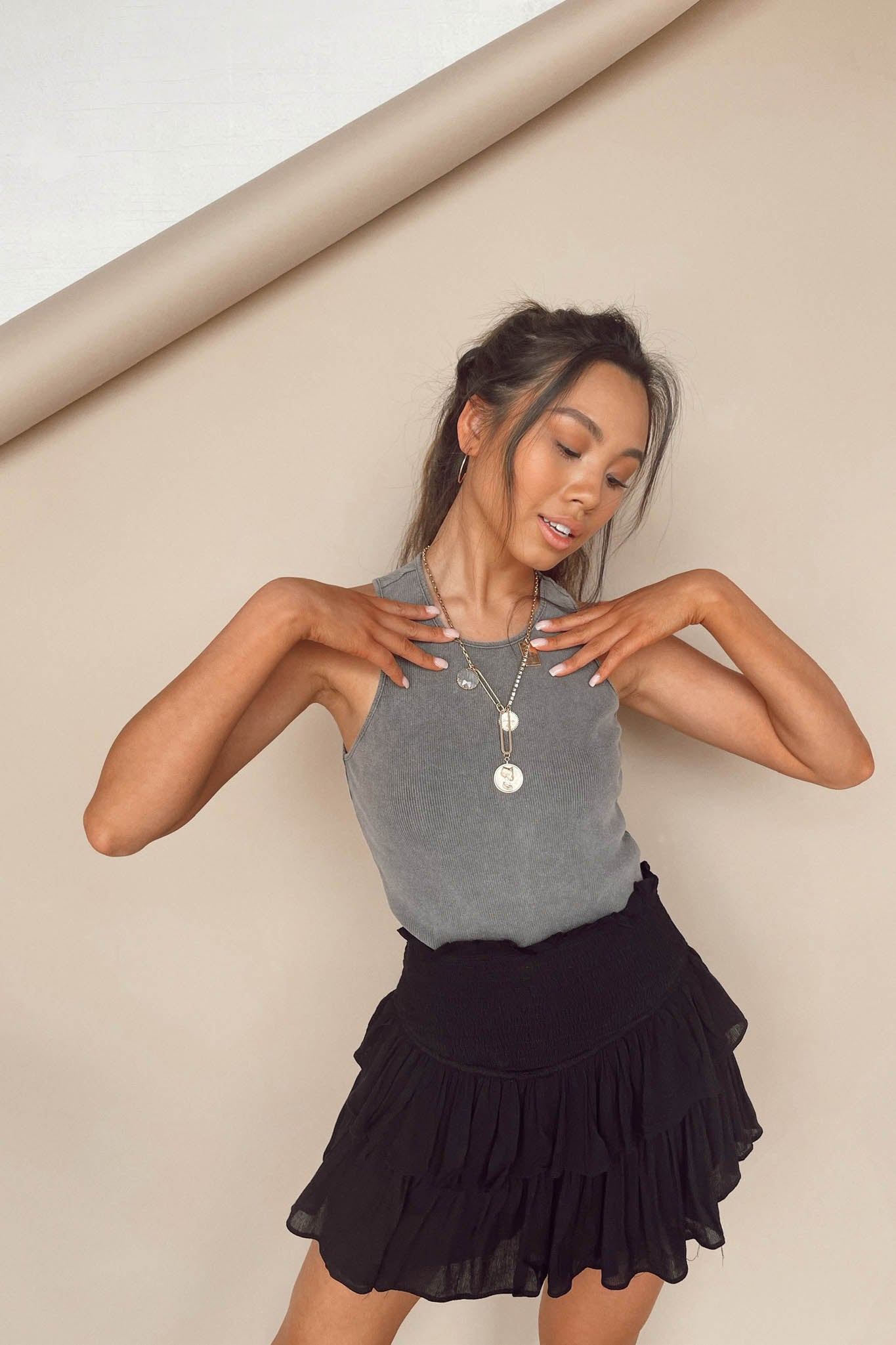 You were born to stand out! This tiered ruffle skort has been a top seller, can't you see why? The smocked waistline makes it a flattering fit on any shape and the shorts beneath make it comfortable for any occasion. Wear it with sneakers and a light weight sweater or throw it on with a t-shirt. Size medium skirt length: 14.5 inches