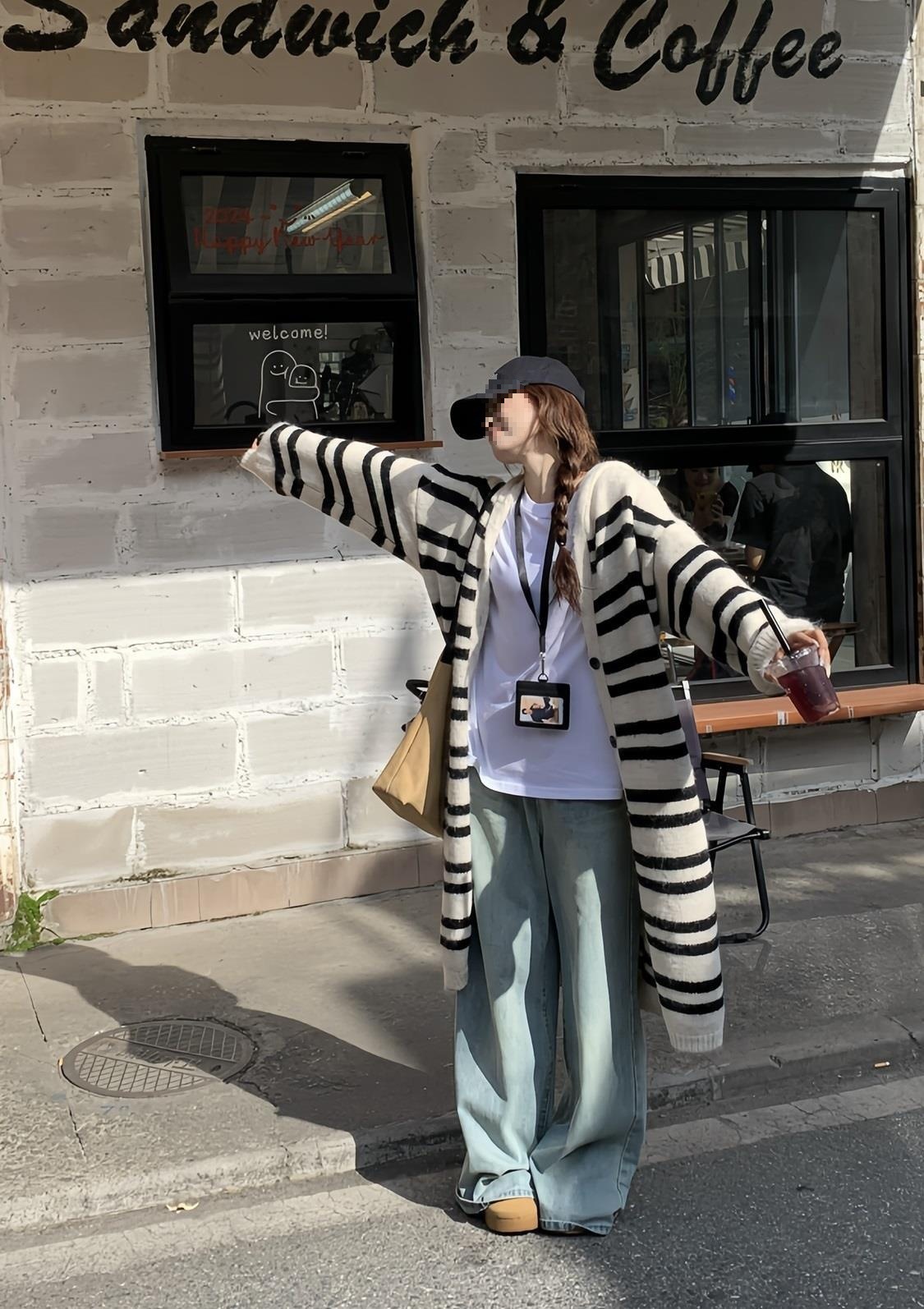Oversized Women Hooded Cardigan Sweater Long Loose Knee Length Knit Coat Striped Autumn Winter